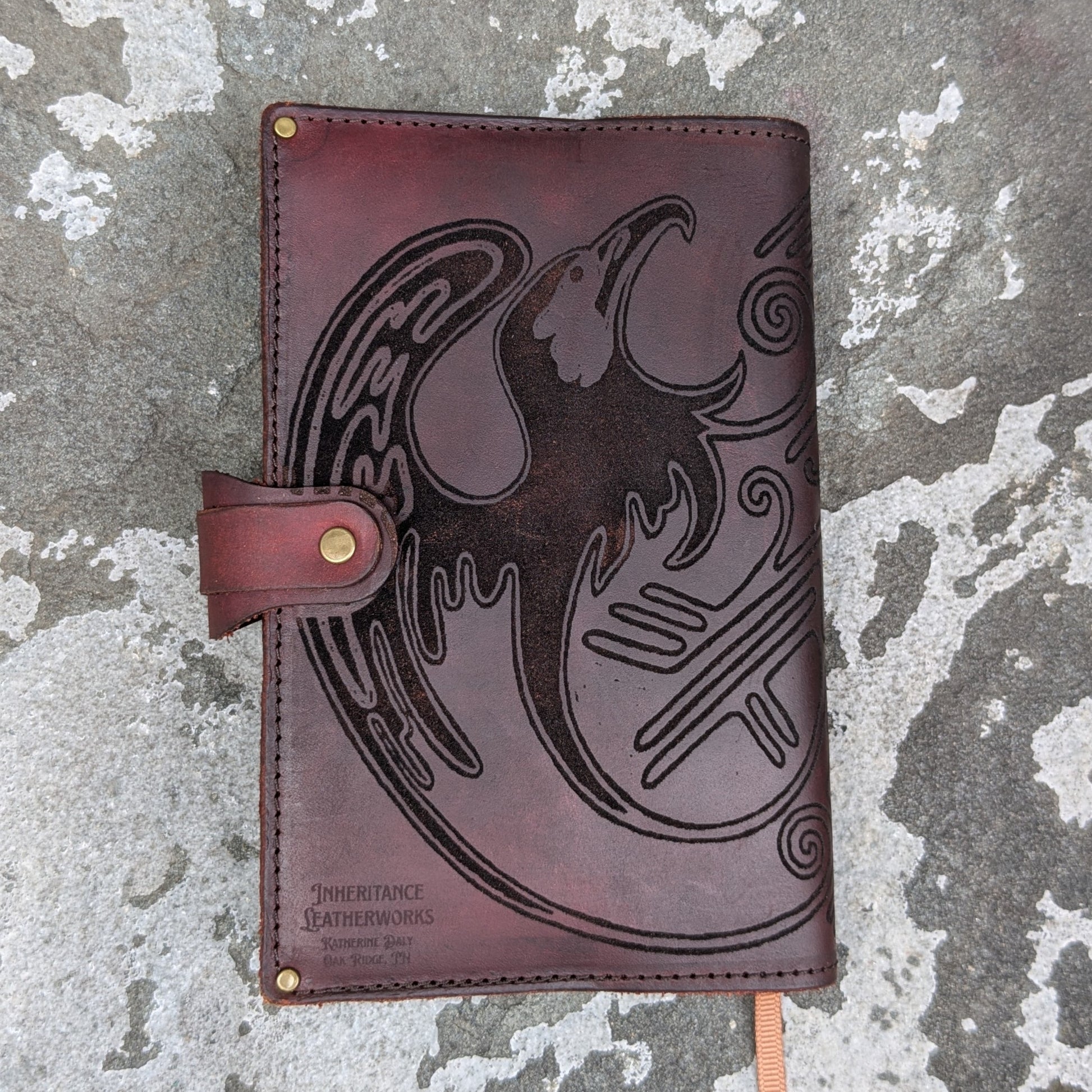 This handmade leather journal is a blend of art, history, and lasting craftsmanship, created by a single artisan in Oak Ridge, Tennessee. The cover is made from hand-dyed leather, laser engraved with imagery sourced from an antique book and brought back to life in a beautifully reimagined format. For this journal, the eagles wrap around the entire book, giving it a pleasing symmetry and an opulent, decorative feel. It’s carefully stitched, reinforced with solid brass rivets, and secured with a snap closure for durability and elegance.