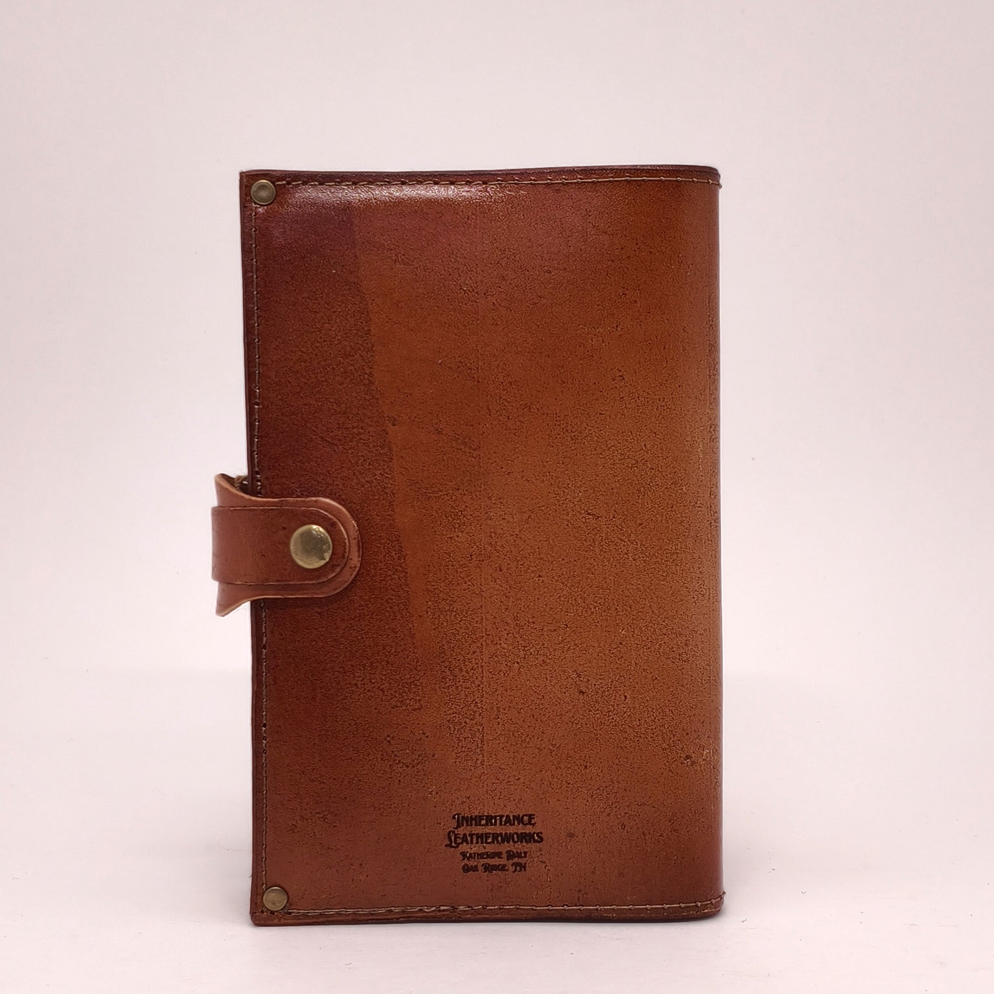 This handmade leather journal is a blend of art, history, and lasting craftsmanship, created by a single artisan in Oak Ridge, Tennessee. The cover is made from hand-dyed leather and laser engraved with an illustration sourced from an antique book. It’s reinforced with solid brass rivets and secured with a snap closure for durability and elegance. The journal features a meticulously hand-painted floral design on an airbrushed background.