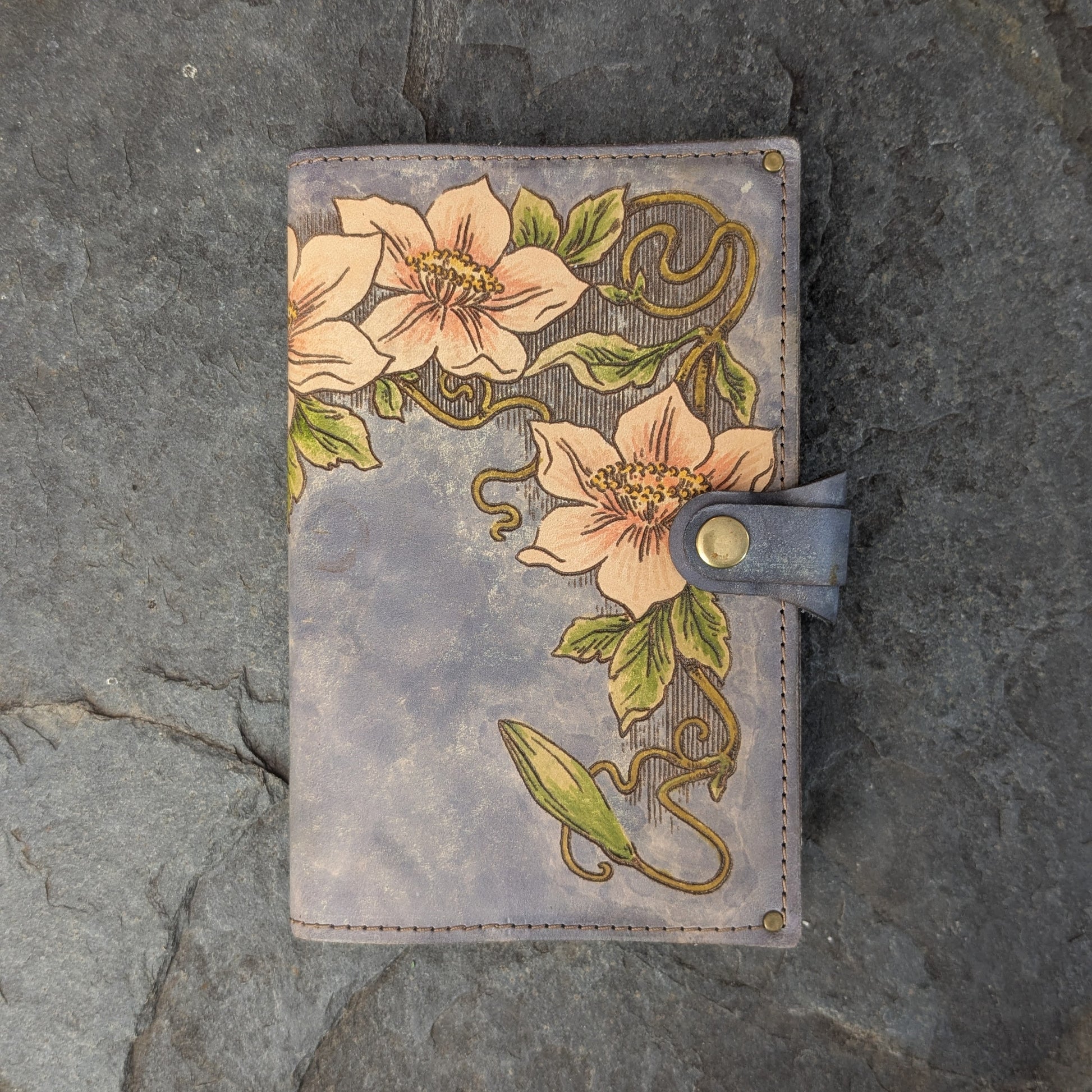 This handmade leather journal is a blend of art, history, and lasting craftsmanship, created by a single artisan in Oak Ridge, Tennessee. The drawing for this piece comes from an antique French magazine from 1912. It is hand-painted with subtle colors reminiscent of the era. The cover is made from top-quality vegetable tanned leather and laser engraved with an art nouveau floral design. It’s carefully stitched, reinforced with solid brass rivets, and secured with a snap closure for durability and elegance.