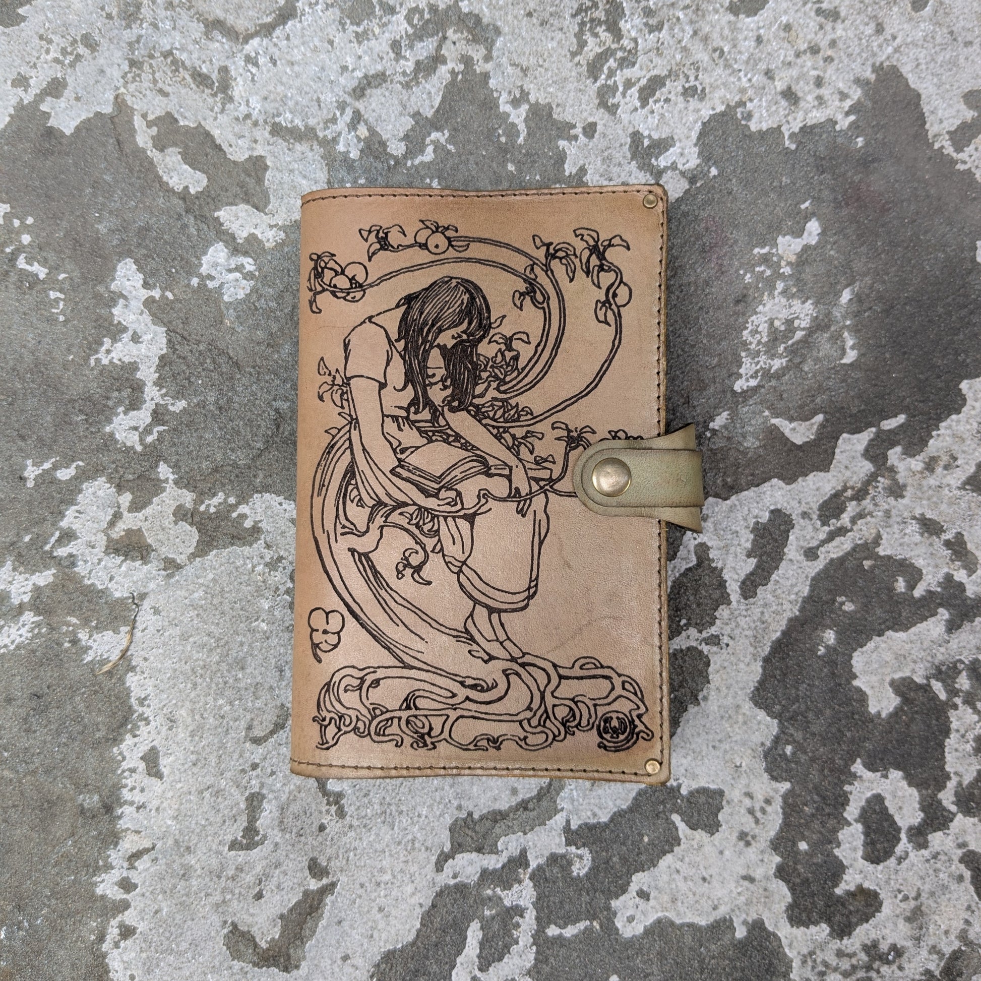 This handmade leather journal is a blend of art, history, and lasting craftsmanship, created by a single artisan in Oak Ridge, Tennessee. The cover is made from hand-dyed leather, laser engraved with imagery sourced from an antique bookplate and brought back to life in a beautifully reimagined format. It’s carefully stitched, reinforced with solid brass rivets, and secured with a snap closure for durability and elegance.