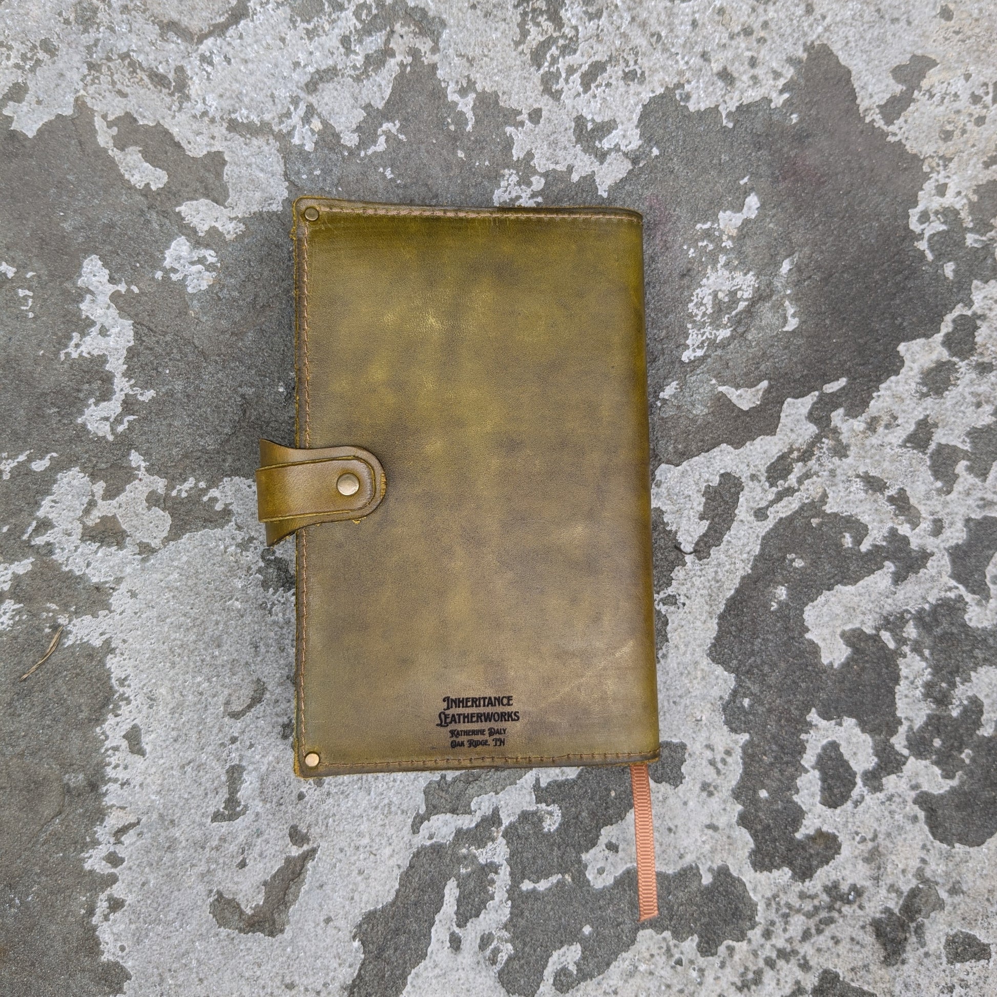 This handmade leather journal is a blend of art, history, and lasting craftsmanship, created by a single artisan in Oak Ridge, Tennessee. The cover is made from hand-dyed leather, laser engraved with imagery sourced from an antique book and brought back to life in a beautifully reimagined format. It’s carefully stitched, reinforced with solid brass rivets, and secured with a snap closure for durability and elegance.