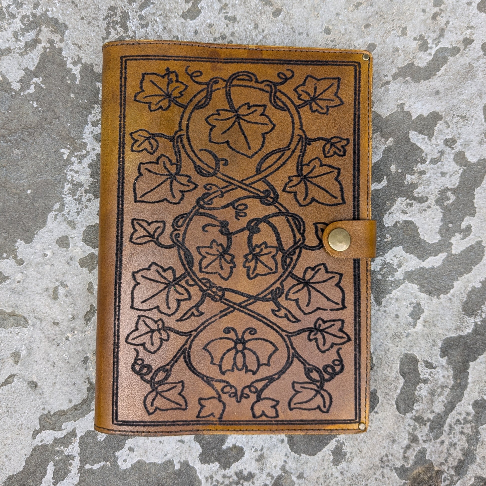 This handmade leather journal is a blend of art, history, and lasting craftsmanship, created by a single artisan in Oak Ridge, Tennessee. The cover is made from hand-dyed leather, laser engraved with imagery sourced from an antique book, and brought back to life in a beautifully reimagined format. It’s carefully stitched, reinforced with solid brass rivets, and secured with a snap closure for durability and elegance.