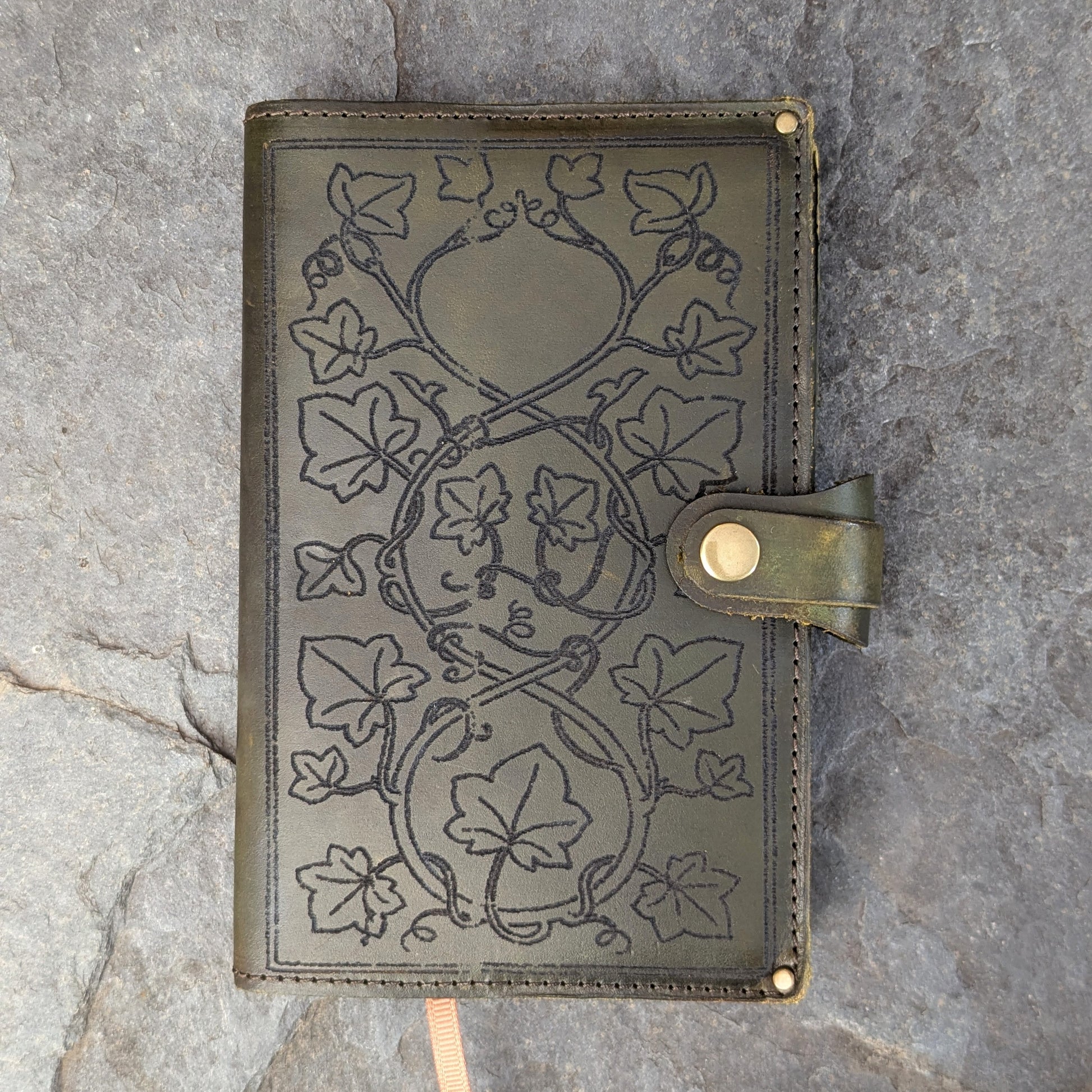 This handmade leather journal is a blend of art, history, and lasting craftsmanship, created by a single artisan in Oak Ridge, Tennessee. The cover is made from hand-dyed leather, laser engraved with imagery sourced from an antique book and brought back to life in a beautifully reimagined format. It’s carefully stitched, reinforced with solid brass rivets, and secured with a snap closure for durability and elegance.