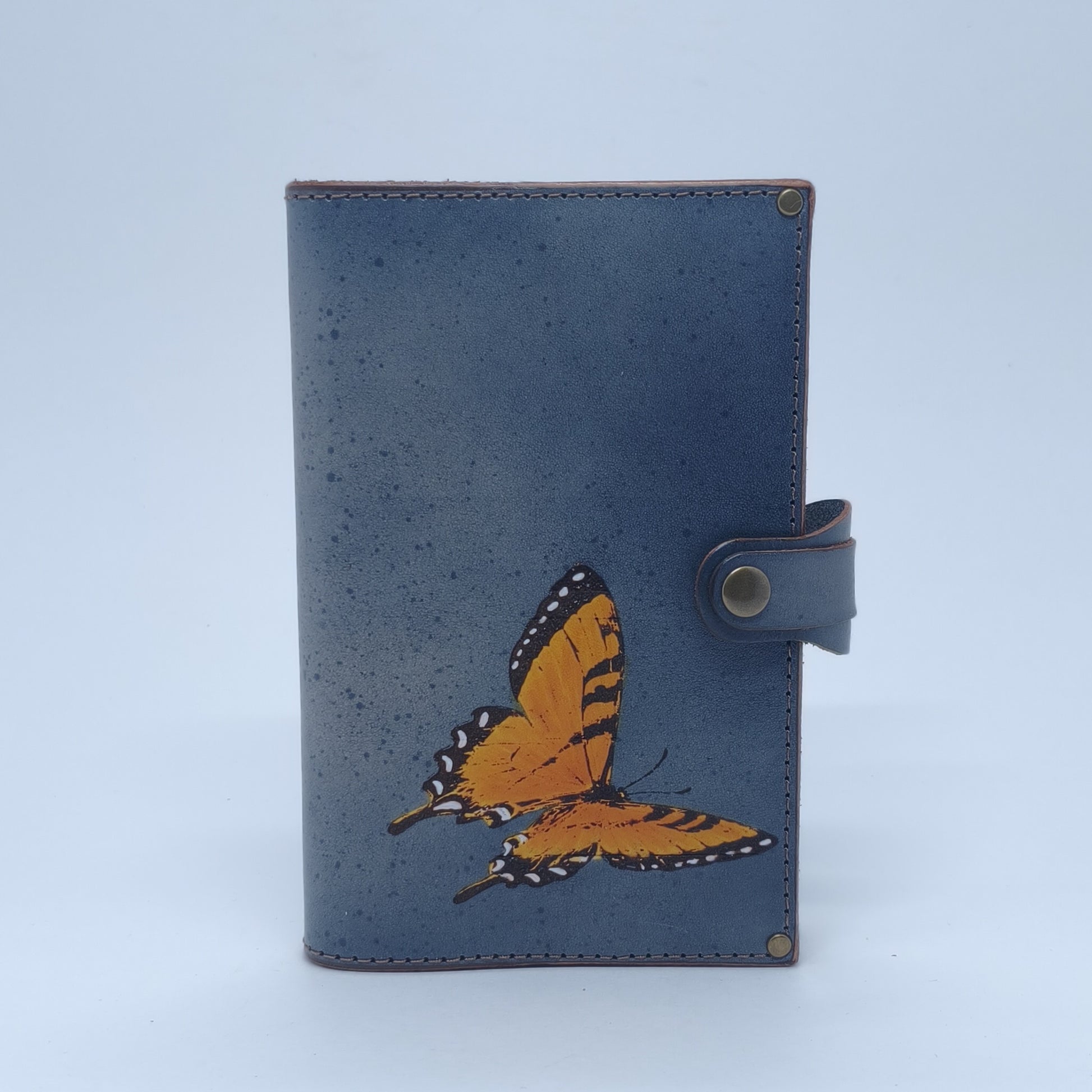 This handmade leather journal is a blend of art, history, and lasting craftsmanship, created by a single artisan in Oak Ridge, Tennessee. The cover is made from hand-dyed leather and laser engraved with imagery sourced from an antique book. The illustration has been carefully colored with layer upon layer of dye, bringing the butterfly to life. It’s reinforced with solid brass rivets and secured with a snap closure for durability and elegance.