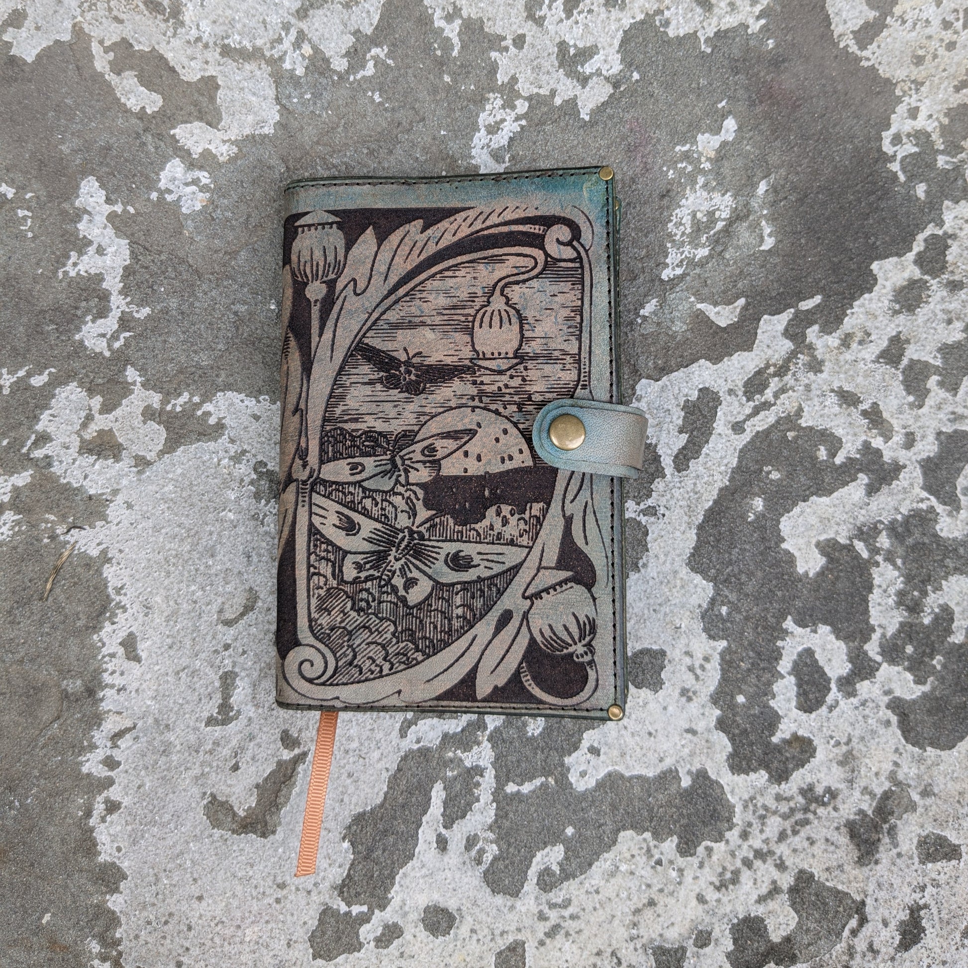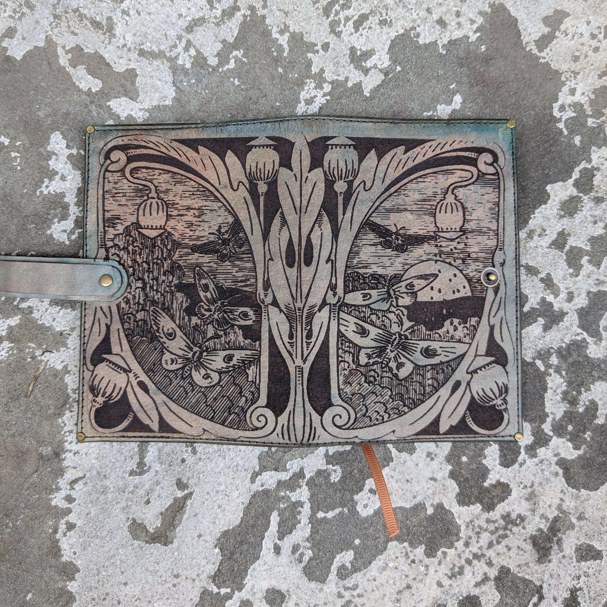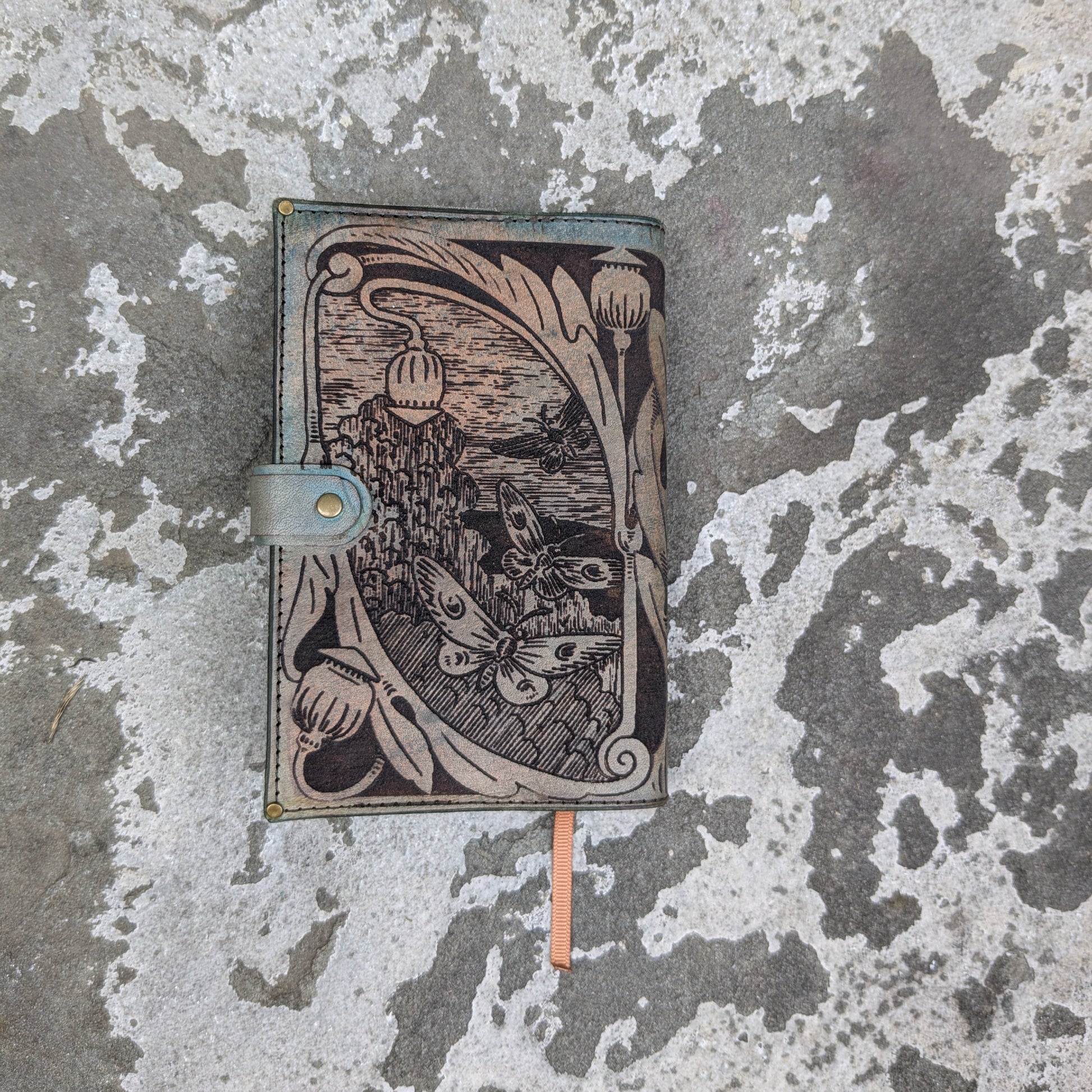 This handmade leather journal is a blend of art, history, and lasting craftsmanship, created by a single artisan in Oak Ridge, Tennessee. The cover is made from hand-dyed leather, laser engraved with imagery sourced from an antique book, and brought back to life in a beautifully reimagined format. For this journal, a large landscape has been wrapped around the entire book, giving both symmetry to the piece but also a bit of something different on front and back. It’s carefully stitched, reinforced with solid brass rivets, and secured with a snap closure for durability and elegance.