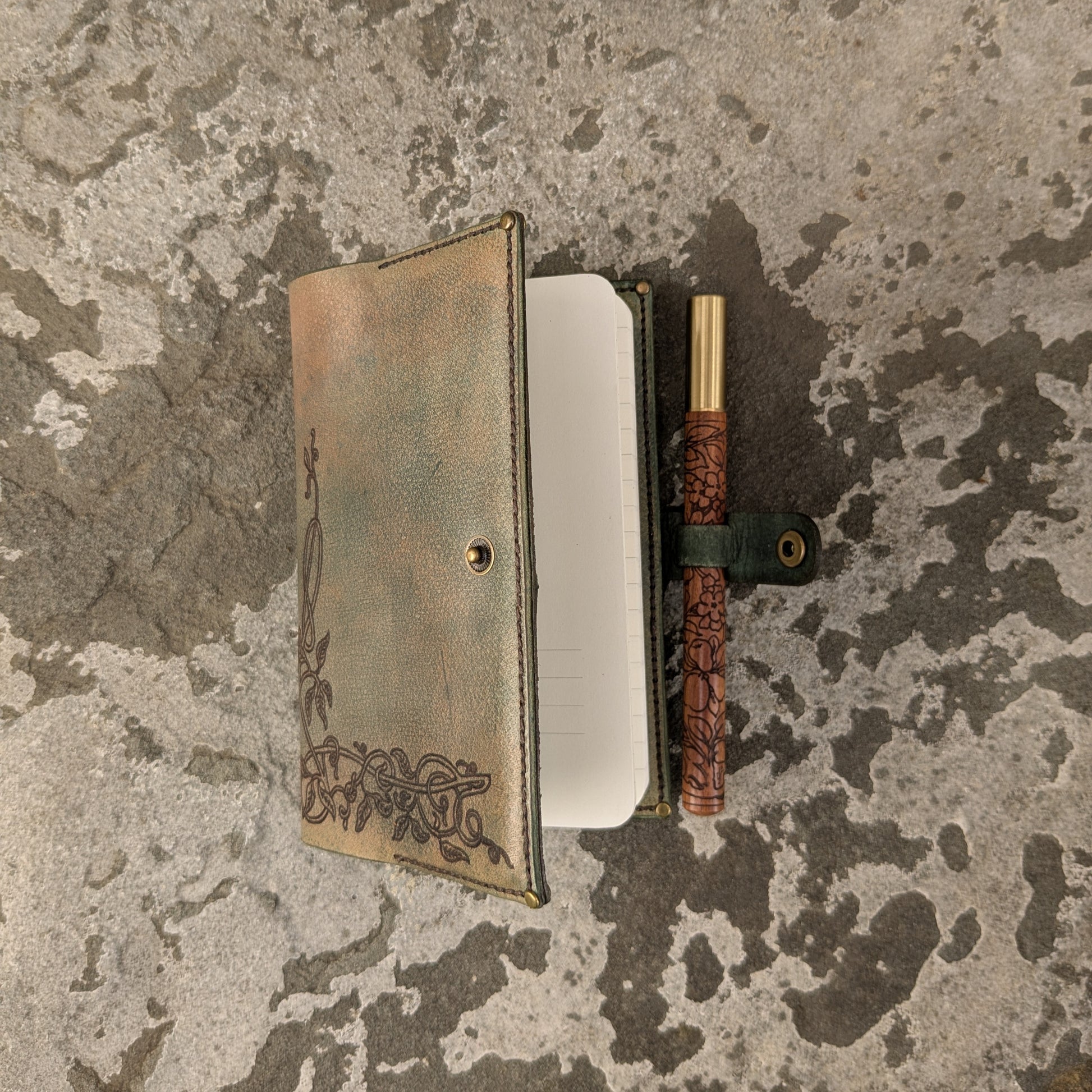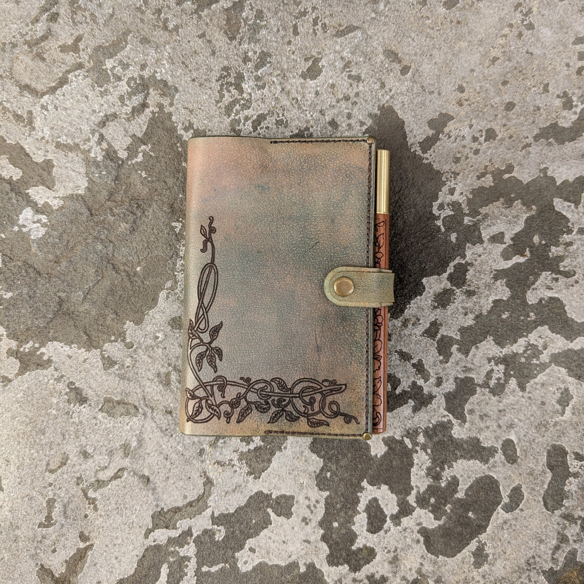 This handmade leather journal is a blend of art, history, and lasting craftsmanship, created by a single artisan in Oak Ridge, Tennessee. The cover is made from hand-dyed leather, laser engraved with imagery sourced from an antique book, and brought back to life in a beautifully reimagined format. It’s carefully stitched, reinforced with solid brass rivets, and secured with a snap closure for durability and elegance.
