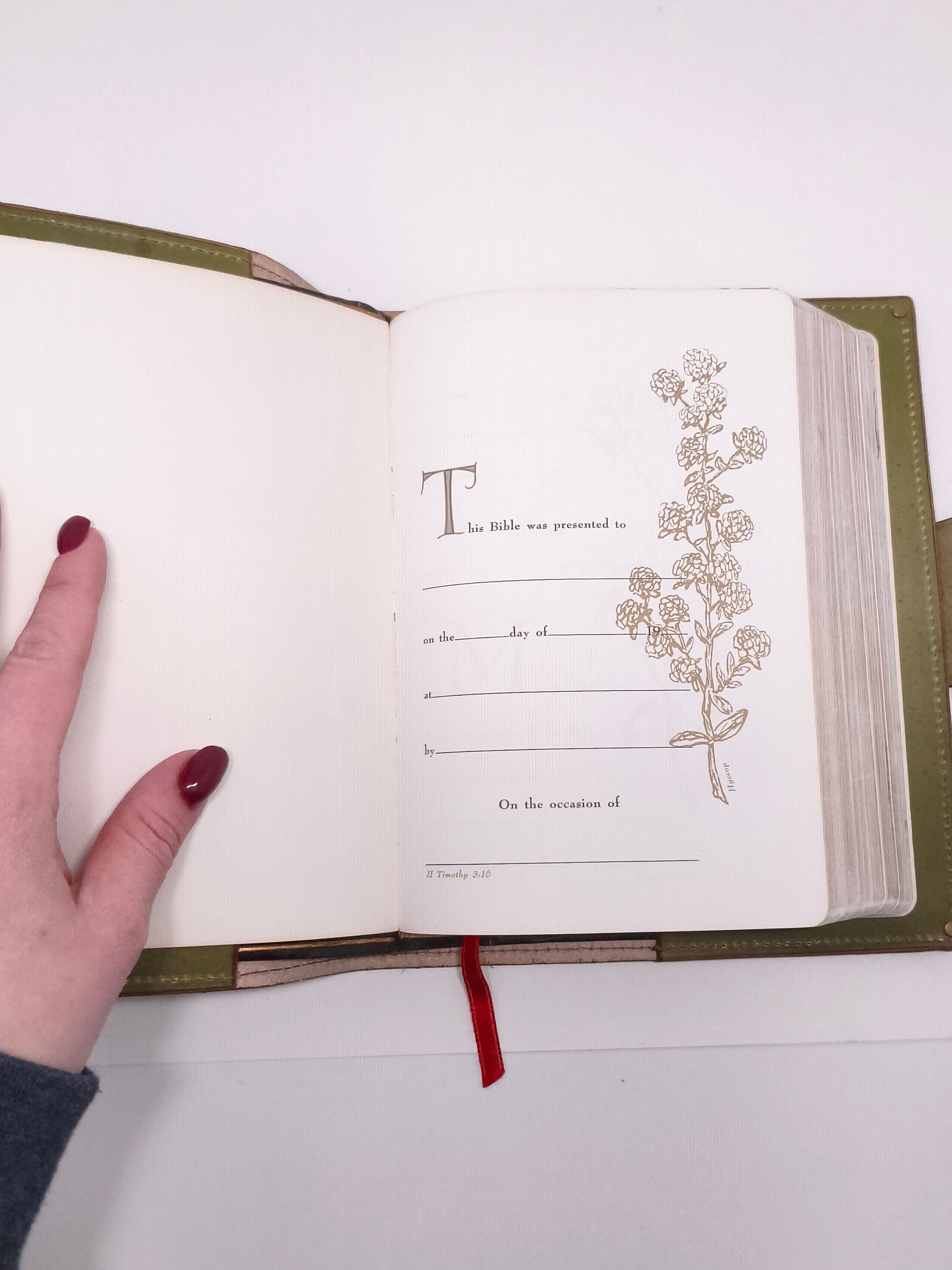 This vintage Bible is in excellent condition and comes in a handmade leather cover. It is a Revised Standard Version, and may be customized to your preferences. The only defect is that a record of a snowfall in 1982 has been recorded on the flyleaf. Otherwise, no annotations that I have found. The Bible has a sewn binding for durability.